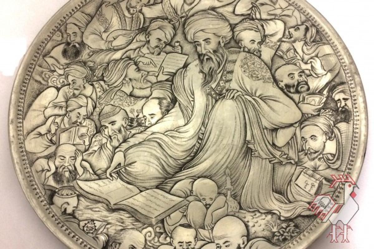 سینی قلمزنی مس،اثر فاخر و هنری استاد سید خدایی،مهردار و امضا دار،کلکسیونی و فوق العاده،طرح رودکی،ریزه قلم فوق العاده،سالم و تمیز
